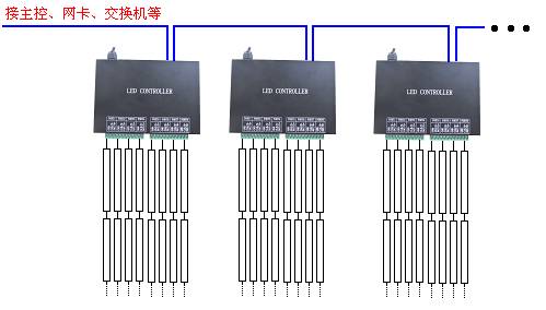 1、用网线连接电脑网卡(或主控)到分控的NET1,NET2连接到下一个分控的NET1,如此级联下去,直到最后一个。也可以用NET2作输入,NET1作输出。
